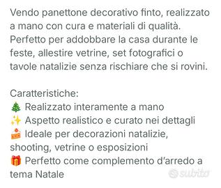 Panettone decorativo natalizio – Fatto a mano Vendo bellissimo panettone decorativo artigianale, ideale per addobbare la casa durante il periodo natalizio. Realizzato con cura nei dettagli: superficie innevata effetto zucchero, palline decorative bianche e rosse, glitter luminosi e un elegante fiocco dorato alla base. Perfetto per vetrine, tavole festive, allestimenti o come centro tavola. Condizioni: nuovo, mai utilizzato. Dimensioni generose e presenza scenica assicurata.
