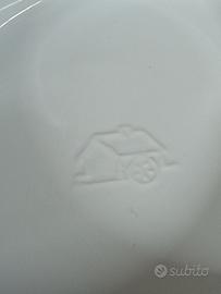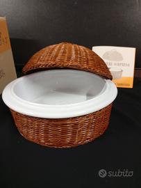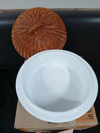 Il paniere a sorpresa Mulino Bianco con cestino in felce intrecciato che racchiude un piatto profondo in ceramica.