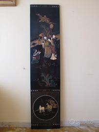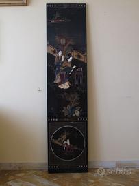 N. 6 Pannelli cinesi in legno dei primi del '900 laccato nero, decorati a mano con pietre incastonate completamente originali in buone condizioni, provenienti da eredità di collezione privata. Misure 172 x 40 x 2 centimetri. Peso per singolo pannello 10 kg. Sono decorati anche sul retro. Utilizzabili per arredare pareti o porte. Ritiro a carico dell’acquirente. Prezzo per singolo pannello. Sconto su quantità. Altre foto su richiesta.
