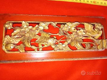antichi parti di pannelli cinesi intagliati a rilievo dorati e laccati.