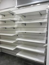 Proponiamo in vendita: n. 10 pannelli dogati di colore bianco dalla dimensione di cm 120x120; n. 24 mensole di colore bianco (con reggimensole) di diverse dimensioni. Tutto come nuovo. il prezzo alla fine comprende tutto quanto sopra elencato.