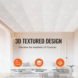 Texture 3D: con un design a trama 3D con un'altezza di 0,24 pollici/0,61 cm e uno spessore di soli 0,02 pollici/0,6 mm, ogni piastrella pesa 10 once/280 g. Offrono sia estetica che leggerezza. Per gli apparecchi di illuminazione, installarli su una base stabile. La texture 3D migliora anche la profondità visiva e l'eleganza del tuo soffitto.