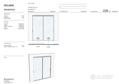 Composizione 2 Pannelli Scorrevoli Rimadesio Velaria. Doppio scorrevole in luce con profili colore alluminio e vetro acidato incluso binario. Larghezza vano luce 248 cm h vano 294 cm