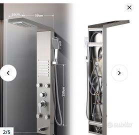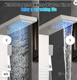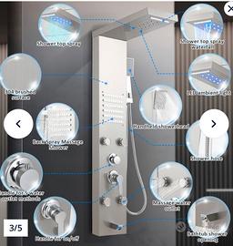 Pannello doccia multifunzionale: ha molteplici funzioni come doccia a pioggia, doccia a cascata, doccia con massaggio alla schiena, bocca per vasca, doccetta in acciaio inossidabile da 1,5 metri e display della temperatura, offrendo un'esperienza doccia lussuosa per rilassare e soddisfare il corpo e la mente. SENSAZIONE MODERNA MIGLIORATA: questo pannello doccia è standard G1/2, compatibile con i dispositivi doccia più comuni e facile da installare. Misura 116 x 50 x 20 x 6,5 cm, è ideale per ristrutturare o aggiornare un bagno esistente. Esperienza doccia personalizzata: sistema doccia 5 in 1 con luce LED, diverse modalità per soddisfare tutte le esigenze personali, pulizia del corpo, getto schiena regolabile, rilassamento muscolare, nutriente schiena, riempimento acqua vasca, luce LED azzurra lenitiva, configurazione su richiesta un'esperienza doccia personalizzata Combinazione di materiali di alta qualità: lo schermo della doccia è realizzato con una scheda principale in acciaio inossidabile 304, con giunti per valvole in ottone e tubi flessibili in PVC antideflagranti all'interno, che sono resistenti alla corrosione e alla ruggine. Mantiene un design di fascia alta consentendoti di farlo goditi una vita sotto la doccia di alta qualità. Ampia gamma di usi: il prodotto è dotato di istruzioni provenienti da cinque paesi e guide grafiche per completare in modo rapido ed efficiente la costruzione della parete doccia. È adatto a molti scenari: bagni domestici, hotel, resort, centri fitness, spa, ecc., Fornitura tu con una vita di fascia alta.