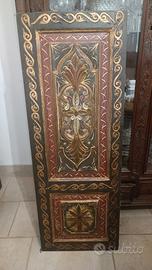 Pannello decorativo ricavato da antica porta in legno massello, finemente dipinto a mano con motivi ornamentali.