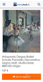 Vendo pannello decorativo in MDF prodotto da Artopweb raffigurante "La lezione di danza" di Degas del 1873. Il pannello, come da foto, presenta una piccola lesione dovuta ad un colpo, nell'angolo in alto a destra. Pronto da appendere, misura 51x58,5 cm. Consegna a mano su Roma.