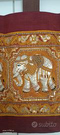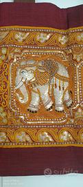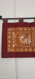 un pannello decorativo in tessuto, ricamato. stile indiano. con il proprio bastone in legno, ritagliato da un pezzo unico . misura 155 x 50. bastone lungo 180. condizioni generali molto bello. manca qualche perlina sulle zampe di elefanti. prezzo d'acquisto nuovo era 500€.