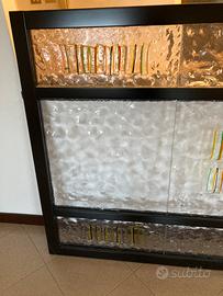 Pannello divisorio in vetro con parti con motivo vetro colorato 181×119 spessore vetro 1 cm. Composto da sei pezzi di cm 57×23 e tre pezzi 57×57,5