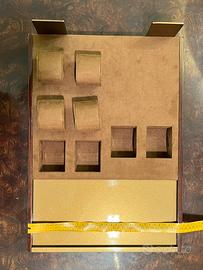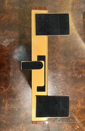 Pannello espositivo GUCCI originale. Struttura importante con finitura lucida color oro caldo, lettere applicate in rilievo e profili laterali in legno. Interno rivestito in velluto color cammello con supporti espositivi. Elemento autentico da arredo showroom o collezione fashion.