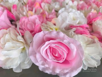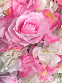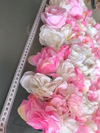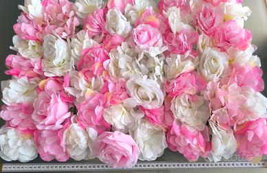 Bellissimo pannello decorativo con fiori in tessuto di varie grandezze, nei toni del bianco e rosa in varie nuance.