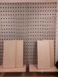 Pannellatura marca JOMM forata 2380x1007mm dotata di 3 mensole in legno 90x40x2,5cm e 36 ganci in metallo. Ideale per negozio, ufficio o cantina/lavanderia