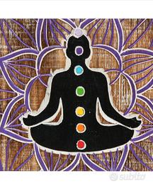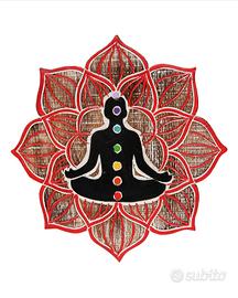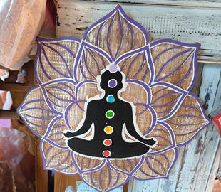 Originali e delicati pannelli in legno esotico realizzati e dipinti a mano da artigiani indonesiani, sagomati a forma di loto, raffiguranti un uomo e i 7 chakra. Intagliati e dipinti a mano donano un tocco di spirito all’ambiente. Belli per arredare scuole di yoga, centri olistici o creare un angolo sacro in casa, un po’ meditattivo.. Disponibili su base marrone chiaro decapata bianca, uomo centrale di color nero e fior di loto rosso o viola. Misure: diametro cm 35 circa, spessore cm 2 circa.