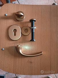 Vendesi pannello interno porta blindata in legno compreso di ferramenta (maniglia, occhiello, copertura ingresso chiave e blocco) color ottone 90x210 spessore 0,5.