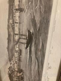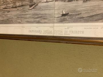Copia integra e incorniciata della litografia "Panorama della Città di Trieste con i nuovi fabbricati della strada ferrata", La veduta comprende tutto il golfo da Punta Grignano a sinistra, passando per monte S. Severo, il molo del sale, fino alla Torre del Fanale e Pirano a destra. Dimensioni 200x40 cm circa