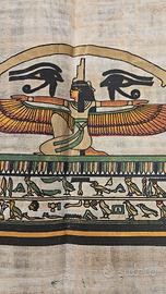 Bellissimo papiro egizio dipinto a mano con scene e geroglifici tradizionali. - Raffigurazione dell'Occhio di Horus e divinità alate. - Dettagli colorati e curati. - Materiale naturale tipico dei papiri.
