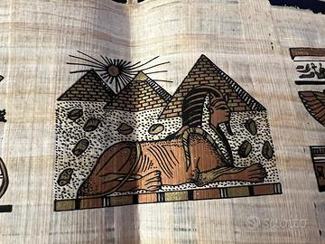 Questo papiro non è un semplice oggetto decorativo, ma una testimonianza tangibile dell'antica civiltà egizia. Ogni scenario rappresenta concetti fondamentali della cultura faraonica: la guerra, la potenza regale, i culti divini, i riti di offerta e il giudizio nell'aldilà. Il papiro, realizzato interamente a mano in Egitto, è accompagnato da un certificato di autenticità e da un testo approfondito esplicativo da conservare insieme all'opera. Riga superiore Il faraone in battaglia: il sovrano guida un carro da guerra lanciato al galoppo, scoccando una freccia contro i nemici. Il leone che corre al suo fianco simboleggia la forza e il coraggio regali, mentre i geroglifici narrano le gesta del re. La Sfinge e le Piramidi di Giza: la maestosa Sfinge, con corpo di leone e volto di faraone, veglia sulle tre Grandi Piramidi illuminate dal sole. La composizione celebra la monumentalità e l'eternità dell'antico Egitto. La dea Iside alata: inginocchiata, apre le ali in gesto di protezione. Indossa la veste rituale e il geroglifico del trono, simbolo del suo nome. Figura di madre e di dea, Iside rappresenta la rinascita e la continuità della vita. Riga inferiore L'offerta agli dèi: il faraone presenta fiori sacri a una dea, forse Hathor o Iside, mentre Horus o Ra assiste con lo scettro. I geroglifici descrivono il rito, segno di devozione e armonia cosmica. Udienza reale: il sovrano è seduto sul trono con gli scettri della regalità, ricevendo omaggi e offerte. L'altare decorato sottolinea la sacralità della figura faraonica, intermediario tra gli dèi e gli uomini. Il giudizio di Osiride: Anubi pesa il cuore del defunto contro la piuma di Maat, simbolo della verità; Thot ne registra l'esito, mentre Osiride, assiso sul trono con la corona Atef, decreta il destino dell'anima. Questo papiro, sintesi di mito, fede e arte, custodisce la memoria immortale dell'antico Egitto e la sua visione dell'eternità.