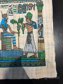 Vendo splendido papiro egizio artigianale, realizzato su autentica fibra di papiro e decorato con una scena tradizionale dell’antico Egitto: una divinità seduta su trono riccamente ornato e un faraone nell’atto di offrire doni rituali.
