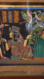 Papiro fatto a mano non meccanizzato, colori vivaci e splendidi, originale, firmato, acquistato in negozio specializzato al Cairo quasi 20 anni fa, introvabile e raro, montato su cornice e doppio vetro che consente di vedere la muratura o parete