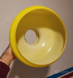 Paralume in vetro, bianco all' interno e giallo all' esterno, per lampadari da cucina anni 60. altezza 22cm, diametro bocca piccola 10cm, diametro bocca Grande 23cm. In ottime condizioni, senza crepe o rotture.