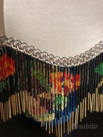 Paralume per lampada grande, diametro 41, altezza cm.32, con coroncina, in tessuto cotone avorio chiaro e rifinito con frangia perline in vetro di murano riporto rosa e fondo nero. Attacco per lampada Edison E 27 grande