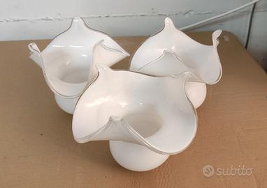 Paralume in vetro a forma di fiore. Colore bianco. Può andare bene per lampade da tavolo, da parete, da terra, lampadari ecc. Oppure può diventare un bellissimo centrotavola porta candela. Foro alla base da 3 cm e diametro totale di circa 19 cm. Sono 3 pezzi in condizioni perfette. Ritiro a Spresiano TV