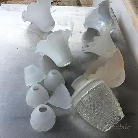 Paralumi in vetro di varie misure, uno risulta con lesione anche se nuovo, i 5 piccoli sono tutti uguali mentre gli altri 6 sono simili ma non uguali tra loro si cedono tutti insieme.