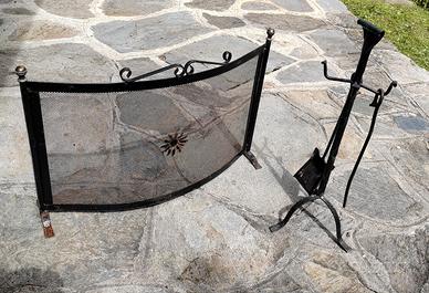 Vendo parascintille (dimensioni 72 x 47 cm), più alcuni accessori camino e portaccessori (altezza 62 cm), il tutto in ferro battuto, con alcuni segni di ruggine.