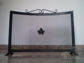 DESCRIZIONE: parascintille per camino curvo a schermo rettangolare in ferro battuto "Made in Italy" da interno e anche per esterno con al centro per decoro una foglia di vite; ha la griglia a maglia fitta in acciaio che rappresenta la protezione ottimale dalle scintille e dal calore per l’area intorno al camino; colore di verniciatura nero; vedere foto