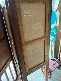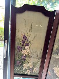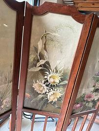 Questo oggetto è un paravento antico a tre ante, un pezzo d'arredamento decorativo e funzionale risalente tipicamente al periodo di fine del XIX secolo.