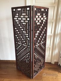 Due pannelli per finestre in legno uniti con cerniere a formare un paravento.