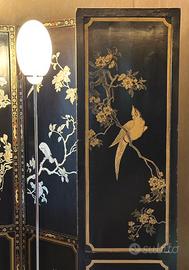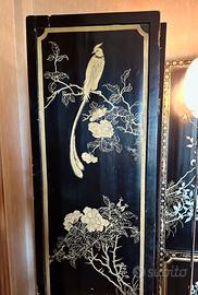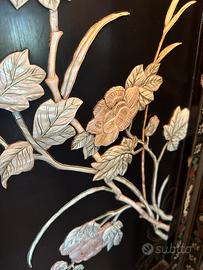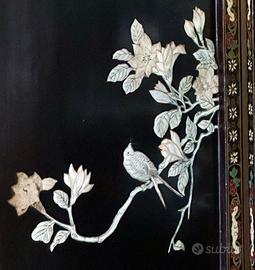 Paravento cinese a quattro pannelli con pregiati intarsi in madreperla irridescente. La madreperla è un materiale di pregio ricavato dallo strato interno della conchiglia di alcuni molluschi, specialmente delle ostriche, di colore bianco perlaceo, e utilizzato per la sua durezza nella produzione di vari oggetti e per la decorazione ad intarsio.