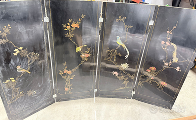Paravento cinese laccato vintage 4 ante – doppia faccia Bellissimo paravento orientale in legno laccato nero, decorato su entrambi i lati: ✔ figure femminili tradizionali ✔ fiori e uccelli dorati Pezzo scenografico, perfetto per arredare casa, locali o set fotografici. ⚠️ Da restaurare (graffi e segni del tempo e purtroppo due visi su 4 da ricostruire) , struttura sana. 💰 Prezzo: € 270 – trattabile 📍 Visionabile trasporto su Milano e provincia 50€