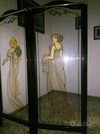 Splendido paravento in Art Nouveau, pieghevole a quattro ante ,realizzato in legno laccato e vetro decorato con eleganti figure femminili inspirate all'estetica degli anni 20/30 ,con linee sinuose e motivi floreali . Le illustrazioni sono realizzate con grande cura nei dettagli e rappresentano le quattro stagioni del famoso dipinto di Alfons Mucha.