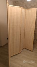 Paravento da interno a 4 ante in Legno e Bamboo, separé da interno. Misure :altezza cm180 e larghezza aperto cm 180, chiuso cm 45. Base rialzata per una ventilazione ottimale, design intrecciato elegante e decorativo stile Boho, colore naturale materiale di qualità, telaio in legno massiccio, ante in rattan di bambù con robuste cerniere in metallo.