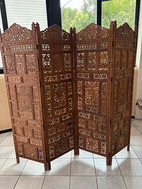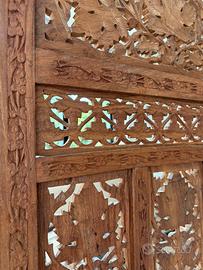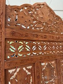 Elegantissimo PARAVENTO completamente realizzato in LEGNO TEAK e INTAGLIATO con motivo floreale. Prodotto di antiquariato orientale.