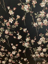 Paravento in legno con alette mobili. Foderato da una parte con tessuto in seta e dall’altra con carta da parati. Misure: h 182, larghezza parte centrale 130, larghezza alette 50.