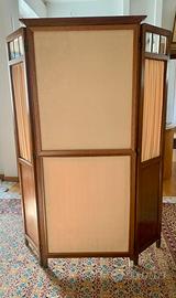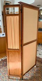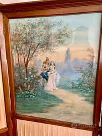 Paravento - Separè a tre ante in legno, con vetri molati decorativi e tessuto in seta con dipinto su tela raffigurante una romantica scena di cm. 70x57. L'apertura totale del separè è di h.164x130, l'anta centrale è h.164 x 66 cm. mentre le altre due sono h.160 x 32 richiudibili. Periodo metà del XX secolo circa.