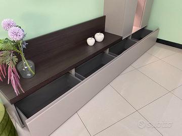 Il top da 6cm di spessore può essere utilizzato sia come piano d’appoggio sia come porta tv. In appoggio sulla 2a base vi sono 2 basi verticali ad apertura push-pull, dotati di ripiani in vetro.