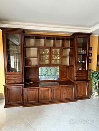 Vendesi maestosa parete attrezzata da soggiorno, realizzata su misura da rinomato artigiano fiorentino. Non è un mobile industriale, ma un pezzo di alta ebanisteria in legno massello, costruito per durare nel tempo e donare eleganza all'ambiente. Il mobile si distingue per l'equilibrio tra spazi espositivi e contenitivi. Il punto di forza è lo splendido pannello centrale in vetro artistico lavorato, che aggiunge un tocco di luce e unicità al design classico. 100% Legno massello di alta qualità. Lunghezza: 310cm Smontaggio e trasporto a carico dell'acquirente