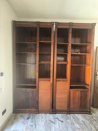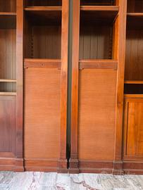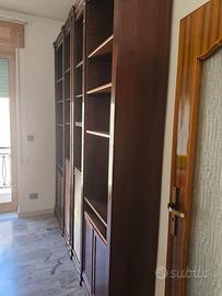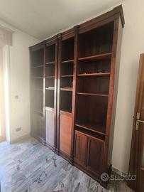 Favolosa Parete attrezzata costituita da due elementi separati di fattura artigianale realizzata in legno massello e con attenzione ai dettagli. Dotata di mensole regolabili grazie ai reggimensole modulari in legno. Dotata di due porticine scorrevoli ad asse verticale con chiusura a chiave.