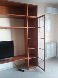 vendo parete attrezzata vuota dotata di mensola per TV, colonna laterale con anta coperta e colonna con vetrinetta.