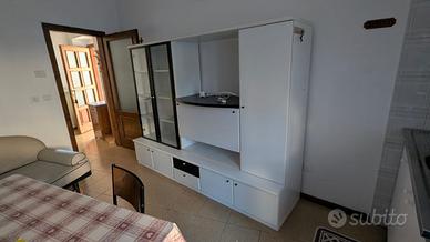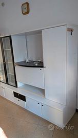 Vendo mobile a parete multifunzionale in finitura bianca opaca, ideale per soggiorno o come ampia dispensa per la cucina/taverna. Il mobile è modulare e offre molto spazio per organizzare stoviglie e oggetti.