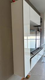 Vendo parete attrezzata da soggiorno composta da 3 pensili sospesi di colore bianco lucido e un cubo nero.