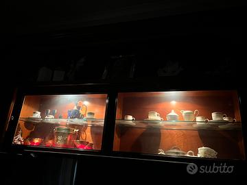 • due ampie vetrine laterali con ripiani in cristallo e illuminazione interna (perfette per servizi di piatti o bicchieri),