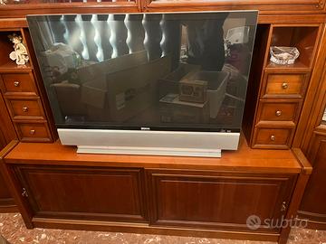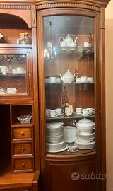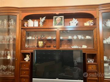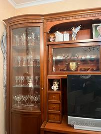 Vendo splendida parete attrezzata in stile classico elegante, realizzata in legno massello color ciliegio, con finiture lavorate a mano e vetrine curve illuminate internamente.