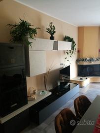 Parete attrezzata Spar mod. "2 Day". Dimensioni (in cm): L. 245 - H. 187,5 - P. 59 - Scocca in laminato e laccata, ante in laminato materico e laccate, top in vetro marmorizzato, eleganti smussature arrotondate degli angoli della scocca e dei frontali cestoni che danno un design caratteristico ed esteticamente gradevole. La parete attrezzata è fornita di un elegante mensolone porta tv a sbalzo, vetrina espositore, vani a giorno, ante e cestoni con chiusura ammortizzata.