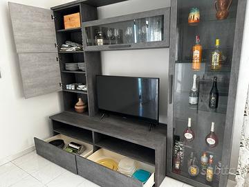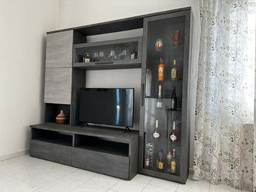 Questa parete attrezzata/credenza è in stile moderno con colori beton-dark e beton-grey, firmata mondo convenienza il modello è un simil Sofia ha due anni di utilizzo ma risulta come nuova.