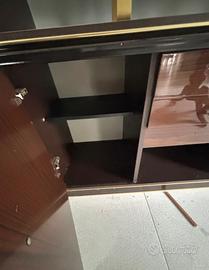 Struttura solida con finitura in legno scuro, inserti dorati e vetri fumé originali.