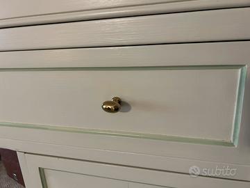 Vendo parete attrezzata e credenza in legno di abete laccato a mano tinta avorio con finitura verde acqua. Pomelli in ottone.