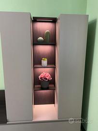 Il top da 6cm di spessore può essere utilizzato sia come piano d’appoggio sia come porta tv. In appoggio sulla 2a base vi sono 2 basi verticali ad apertura push-pull, dotati di ripiani in vetro.